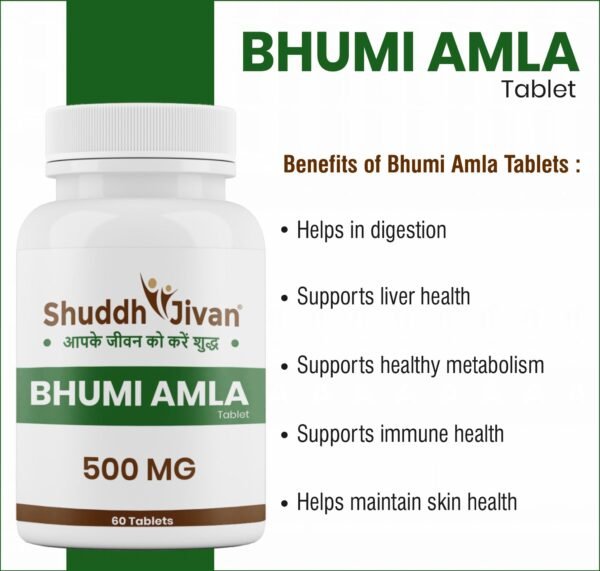 Shuddh Jivan Bhumi Amla Tablet is an Ayurvedic supplement formulated with Bhumi Amla (Phyllanthus niruri), a time-honored herb known for supporting liver and digestive health. In Ayurveda, Bhumi Amla is traditionally used to promote detoxification and maintain metabolic balance.
