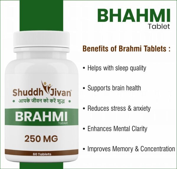 Shuddh Jivan Brahmi Tablet is an Ayurvedic supplement formulated with Brahmi (Bacopa monnieri), a time-honored herb valued in Ayurveda for supporting memory and mental performance. Traditionally used to promote clarity, focus, and emotional balance, Brahmi helps maintain overall cognitive wellness.